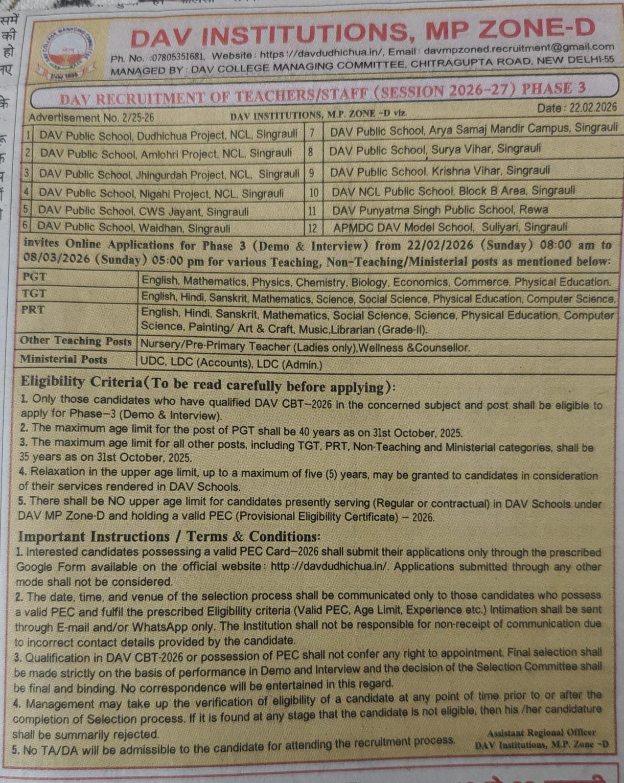 DAV staff recruitment of TEACHERS/STAFF (Session 2026-27) Phase 3